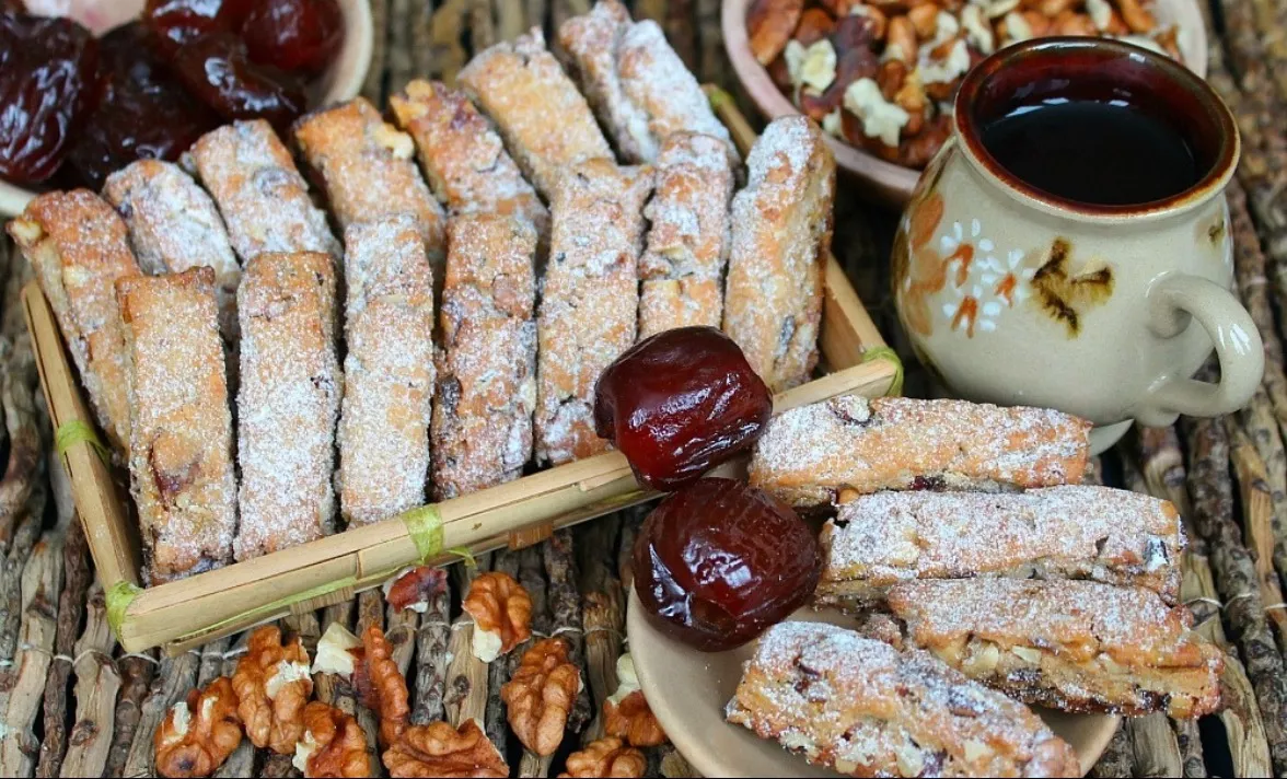 We will prepare cookies with pieces of walnuts and dates. Dates give baked goods a sweet taste, so we add sugar to a minimum. These cookies are perfect for homemade tea parties. For dates, cookies are crumbly and sweet. It is advisable to consume nuts raw or slightly dried. Adjust the amount of nuts and dates to your liking. When baking, look at the color of the cookies, when the crust has turned golden, the cookies are ready.