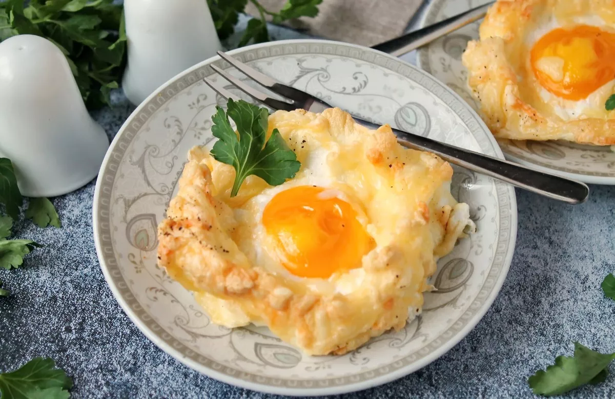 5. Place the tin with eggs in a hot oven and bake at a temperature of 180 degrees for 6-8 minutes until the cheese crust has a golden color. Feed the cooked eggs immediately in a fluffy nest. -